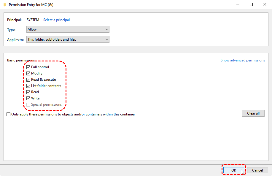 Step 3: Make sure "Full Control" is checked. If your account is not listed, click "Add", enter your username, and then assign "Full Control".