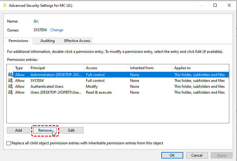 Highlight each listed username. Click "Remove" for every user shown. This clears any corrupted or misconfigured permissions.