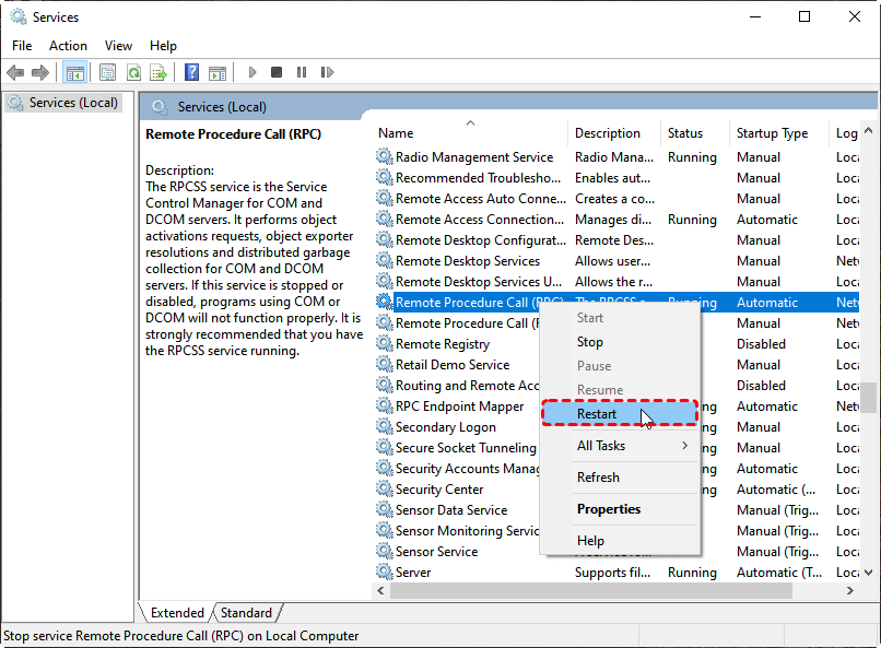 Step 2. Scroll down and find Remote Procedure Call (RPC). Right-click RPC and select "Restart". If the Restart option is greyed out, make sure the service is running. If it’s stopped, select "Start".