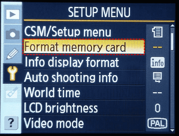 2. Navigate to the SETUP MENU (the spanner icon), select FORMAT MEMORY CARD.