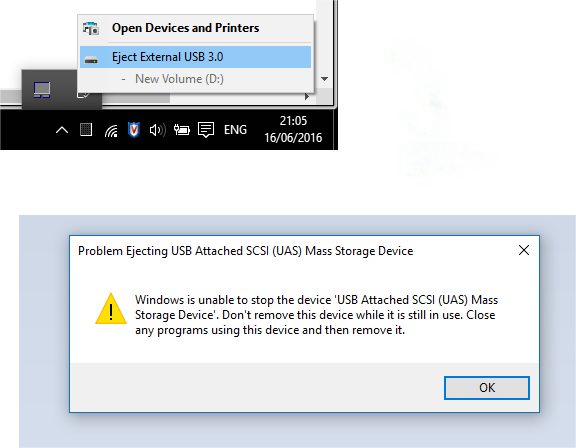 If any processes are running from the external drive, it will prevent the hard drive from being ejected, you can manually end the background process in Task Manager.
