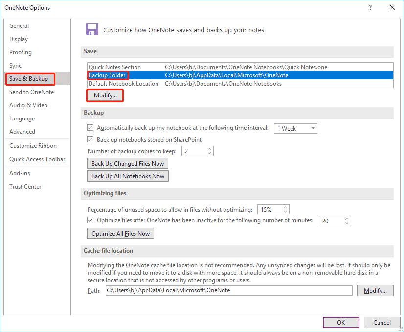 1. Open OneNote and go to File > Options > Save & Backup.
