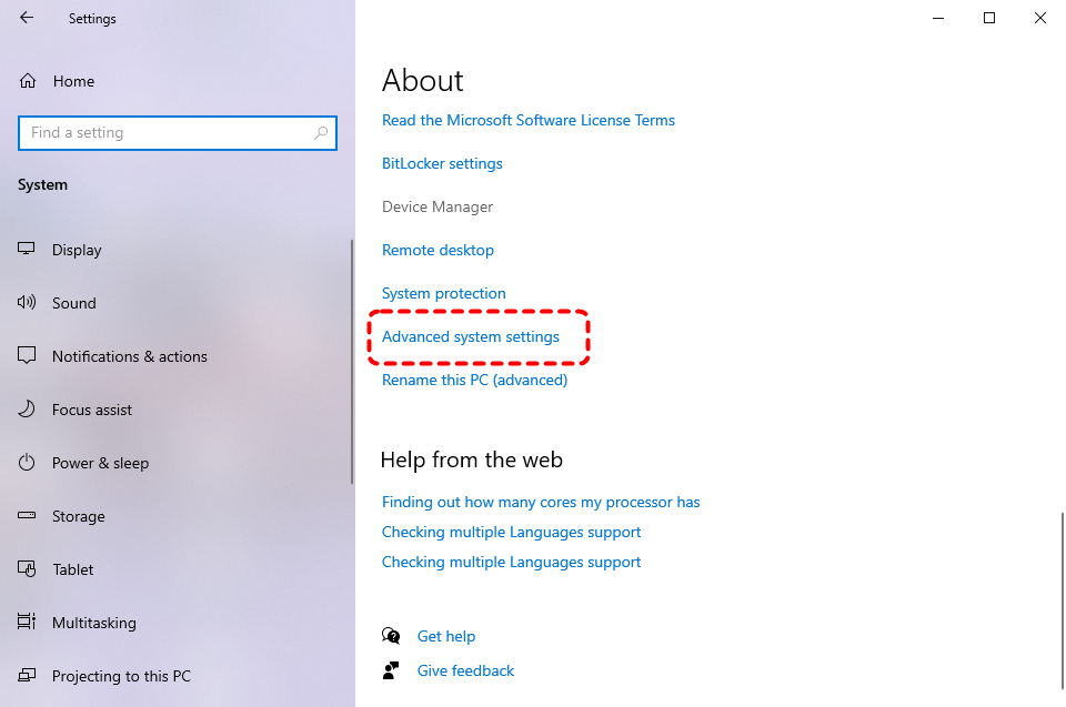 Step 2. Under the "Related settings" and click "Advanced system settings".