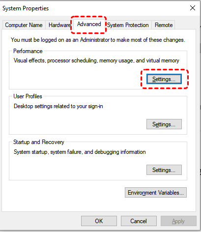 Step 3. In the opened System Properties window, locate the "Advanced" tab and click "Settings" under "Performance" section.