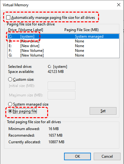 Step 2. Uncheck "Automatically manage paging file size for all drives" and select the C: drive, then choose "No paging file". Click "Set" to save the changes.