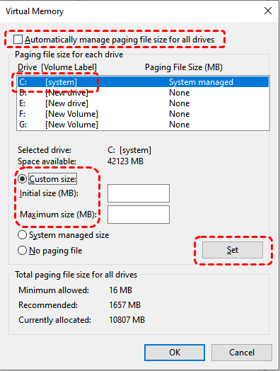 Step 5. Uncheck "Automatically manage paging file size for all drives", select your system drive (usually C:), then choose "Custom size", then enter an "Initial size" and "Maximum size".