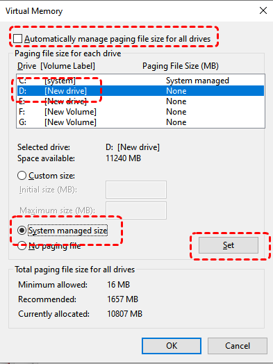 Step 4. Select another drive (e.g., D:), choose "System managed size" or "Custom size", then click "Set".