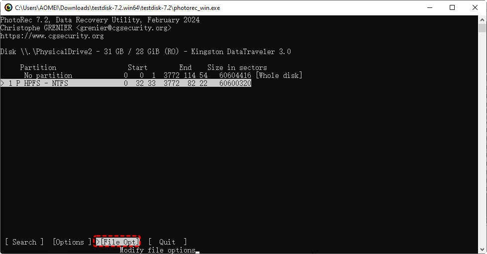 Before starting recovery, you can choose “File Opt” when specifying the target partition in "Step 3". Check or uncheck file types to recover only specific types of files (e.g., photos, videos, documents).This can speed up the process and reduce clutter in the recovered folder.