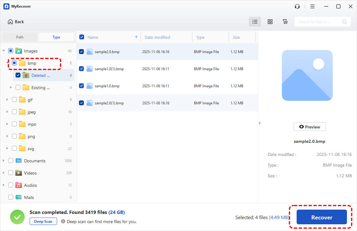 Step 3. Under the "Type" tab, locate the "bmp" folder where stores all the files with "bmp" extension and click "Recover".