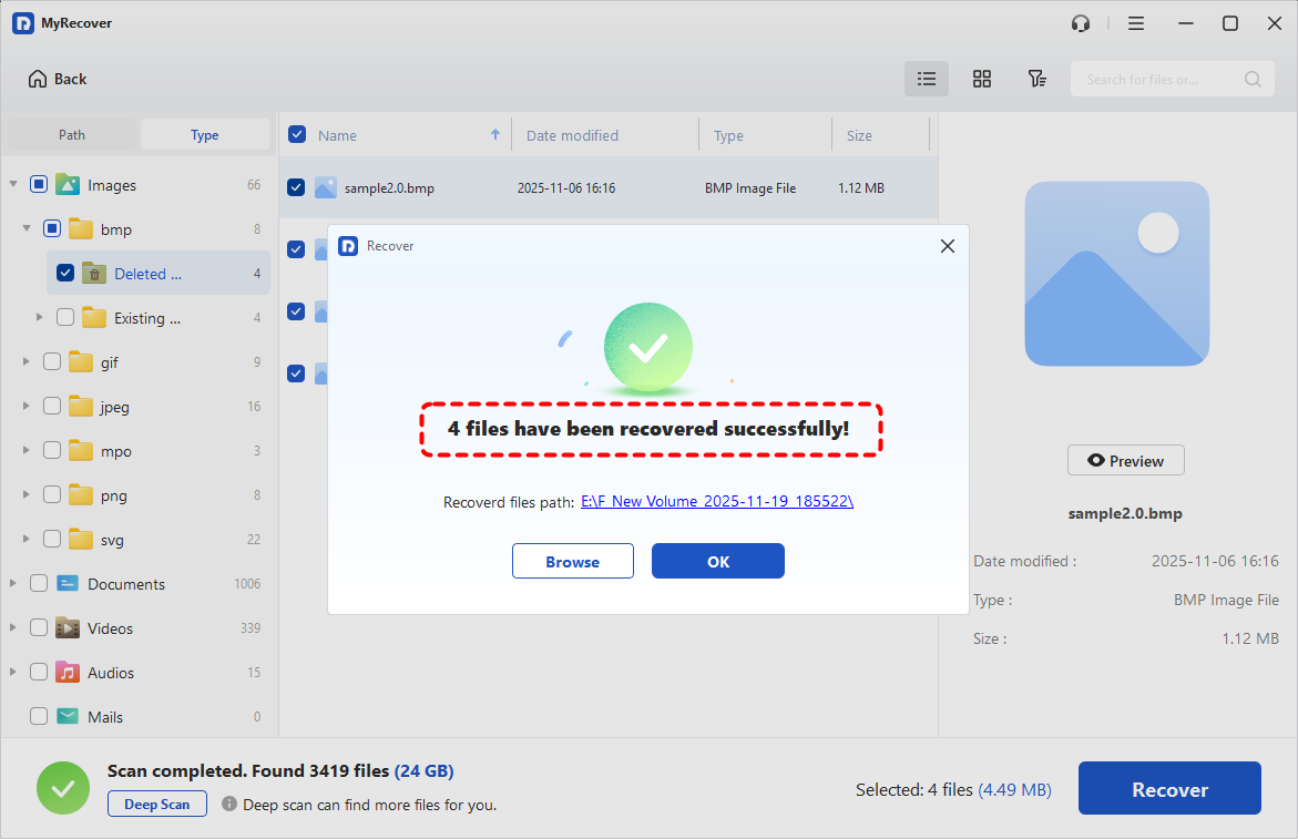 ✅Supports 1000+ File Formats: Unlike basic recovery tools, MyRecover can recover a variety of file types, including BMP, RAR, PNG, ARW and more.