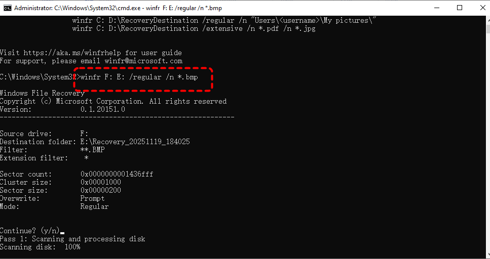 Step 3. Type the following command "winfr F: E: /regular /n *.bmp" and hit "Enter" key. Replace the drive letters "F" and "E" with your actual drive letters.