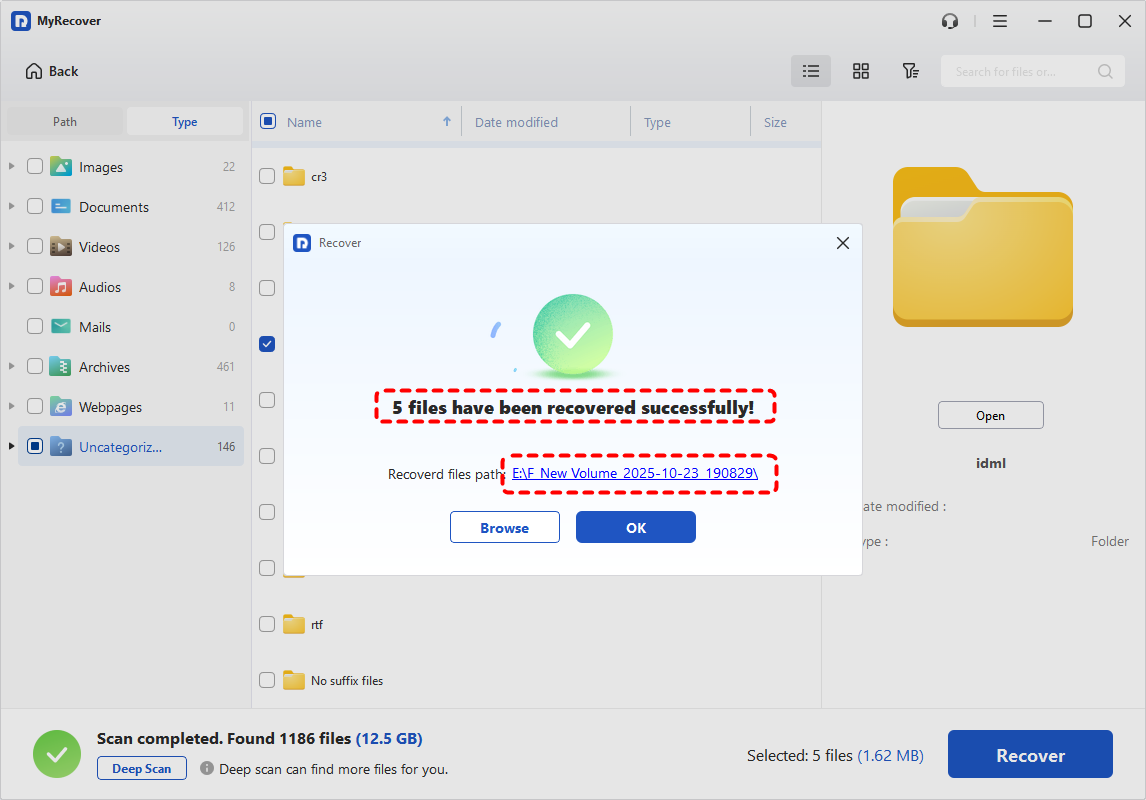 Once the process is finished, the message "Files have been recovered successfully" will pop up. You can check the recovered files by clicking the destination folder path or "Browse" button.