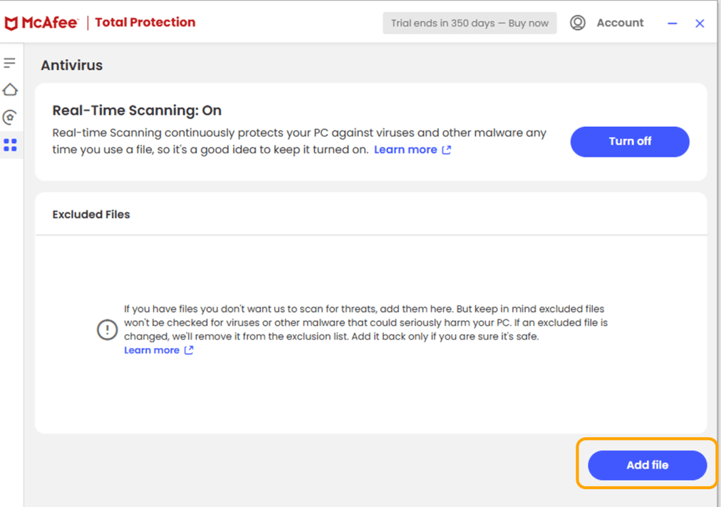 4. Select Add File. Choose the file you want McAfee to ignore.