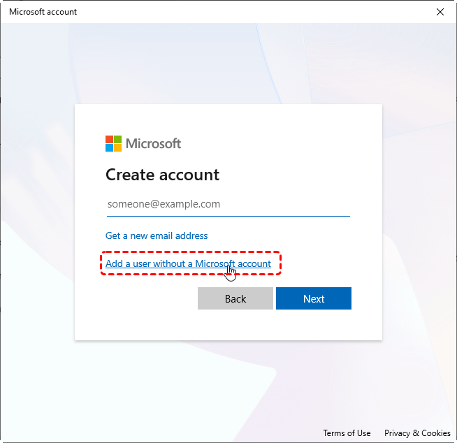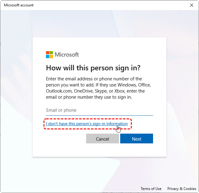 Step 2: Select "I don't have this person's sign-in information" then choose "Add a user without a Microsoft account."