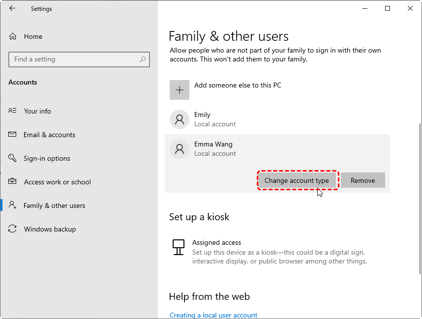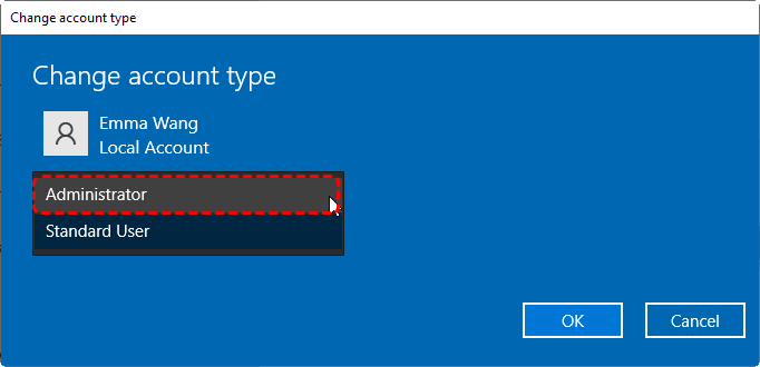 Step 4: Return to the user list and click the new account. Select "Change account type" and set it to "Administrator".