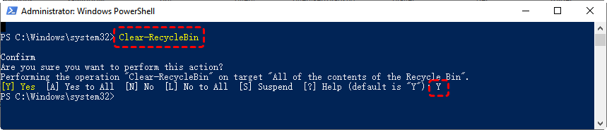 Step 2. In the elevated PowerShell window, type the command: Clear-RecycleBin and press Enter: