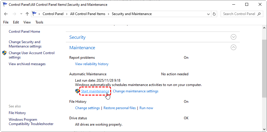 Step 2. Click the arrow on the left of Maintenance to expand the section. Under "Automatic Maintenance," click the "Start maintenance" button.