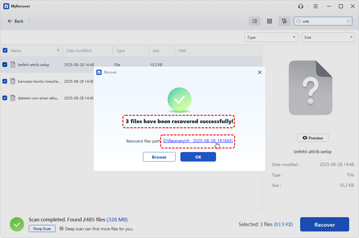 Once the recovery is completed, you will see a mini window, on which you can know how many files have been successfully recovered and where they are saved now. By clicking on the path or "Browse" button, you can directly open the recovered files to ensure they are intact and usable.