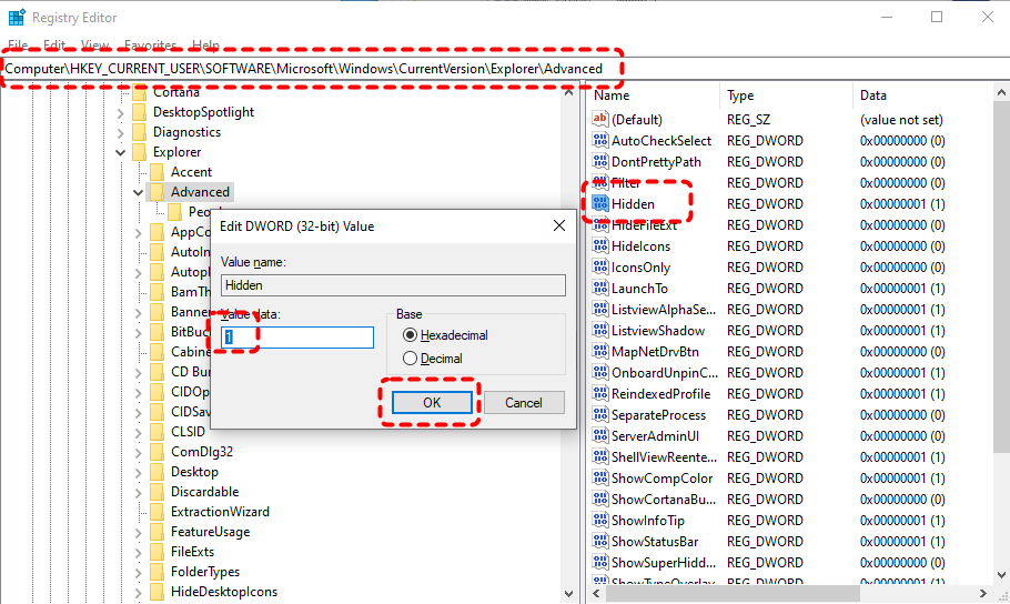 If neither of the above two methods works to locate the hidden files, you may also adjust the hidden settings through the Registry Editor to show them.