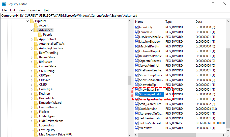 HKEY_CURRENT_USER\Software\Microsoft\Windows\CurrentVersion\Explorer\Advanced