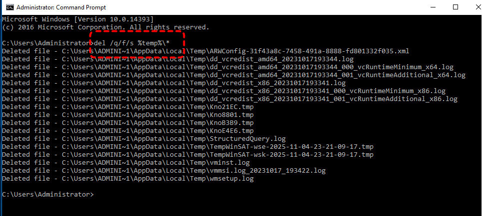 Once the command finishes, the temporary files in C:\Users\User Name\AppData\Local\Temp will be deleted entirely.
