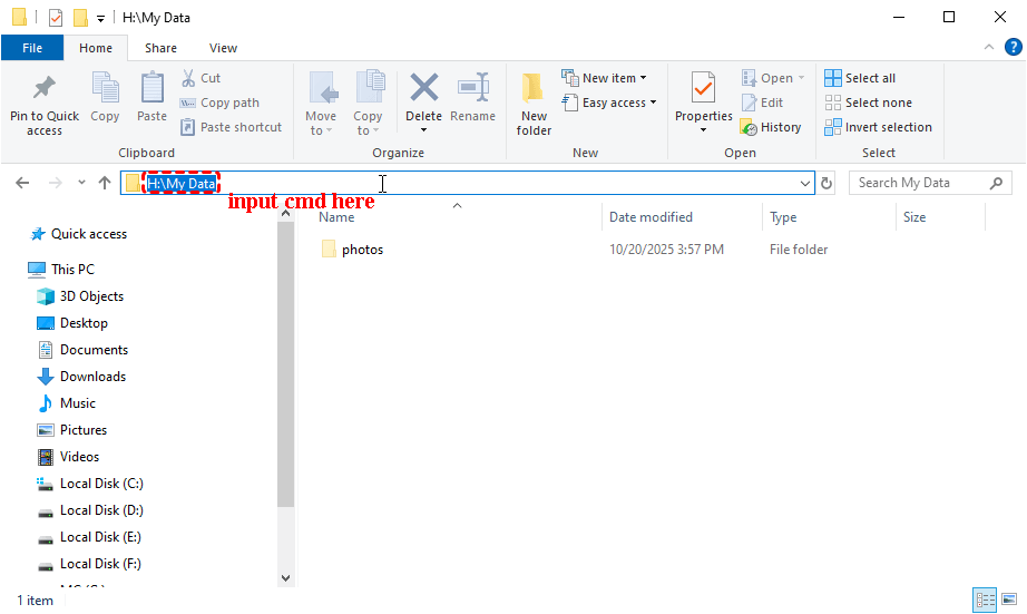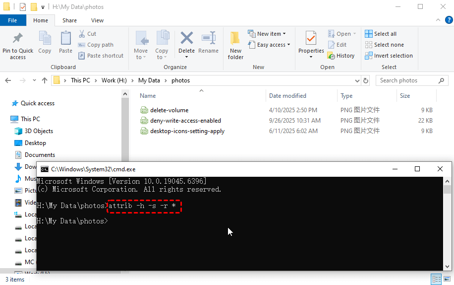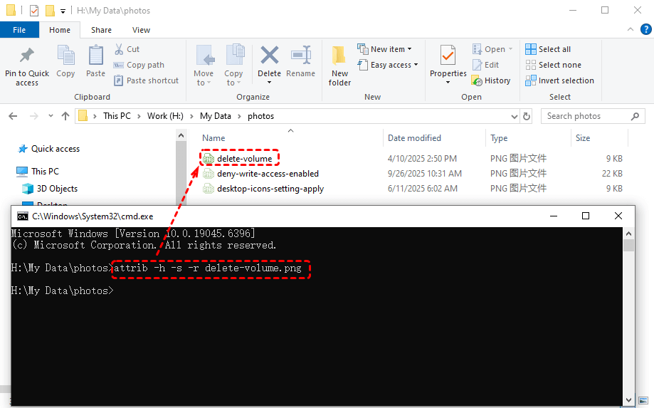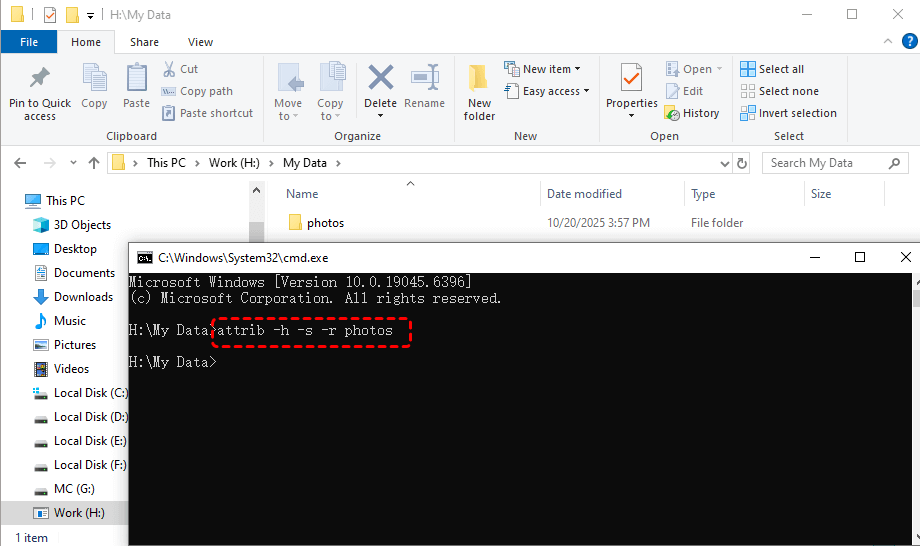 Step 3: In the Command Prompt window that appears, you should see the prompt like "H:\My Data>". Complete the command by typing: attrib -h -s -r photos