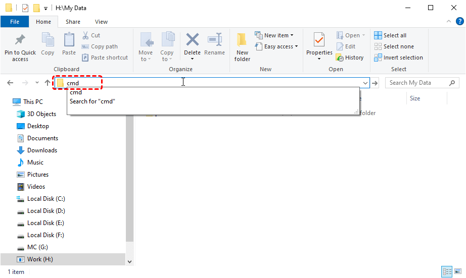 Step 2: In the File Explorer address bar, type "cmd" and press Enter. This will open a Command Prompt window at that folder location.