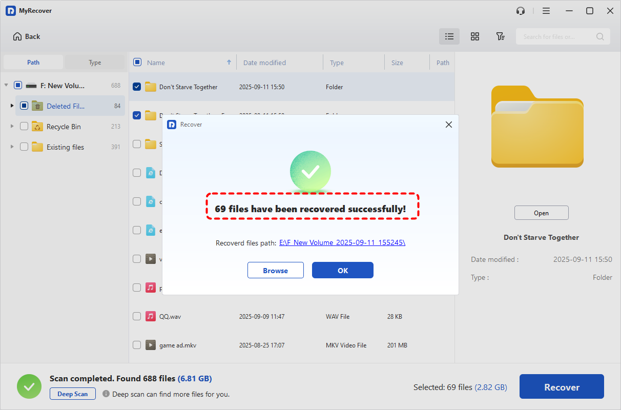 When the process is completed, the message indicating successful recovery will pop up. You can check the recovered files by clicking on the destination folder path or "Browse" button.
