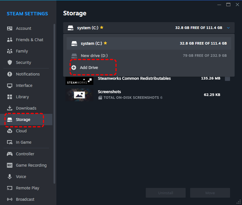 Step 2. Locate "Storage", click "Add Drive" and select the location where your Steam games are installed.