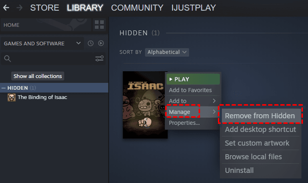Step 4. Right click on the game and select "Manage" and "Remove from Hidden". The hidden games will reappear in your library.