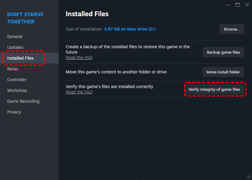Step 2. Choose the corrupted game and right click on it, then select "Properties" > "Installed Files" > "Verify integrity of game files".