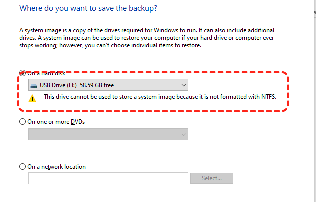 'This drive cannot be used to store the systems image because it is not formatted with NTFS.'