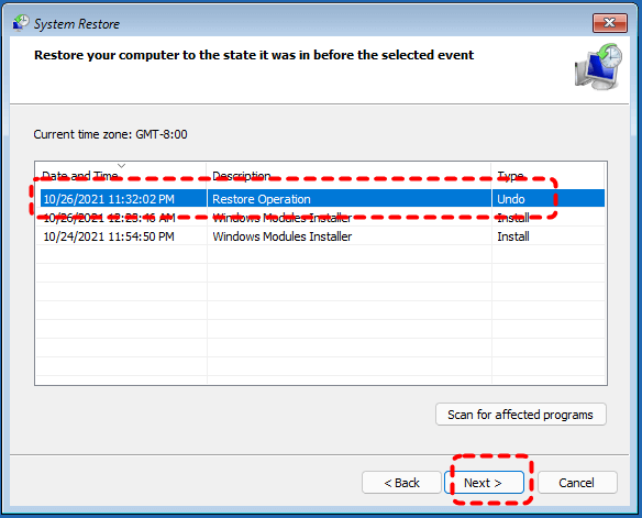 Step 4. Select the restore point which as Undo under the "Type" column and click "Next".