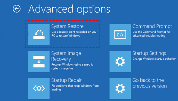 Step 1. Restart your PC and press Shift + Restart to enter Advanced Startup. Click "Troubleshoot" > "Advanced options" > "System Restore".
