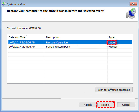 Step 3. Select the restore point labeled "Undo" under the Type column, and click "Next".