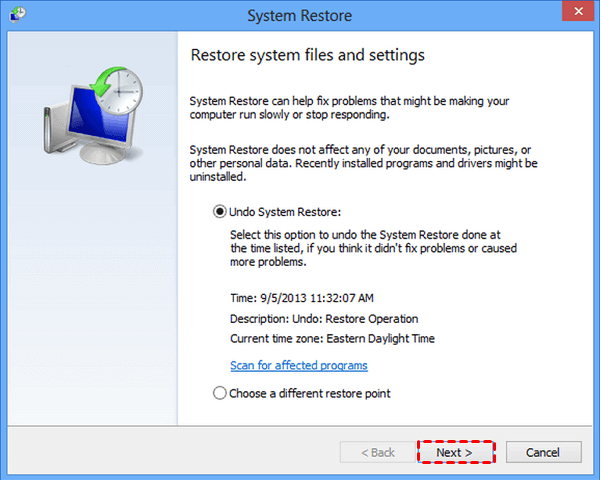 After recovering and backing up your precious data, you can proceed to the next part to learn the specific method of how to undo Windows System Restore.