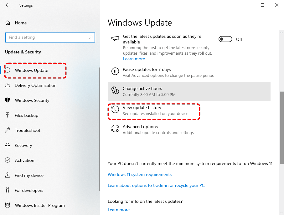 Step 2. In the Windows Update section, select "View update history", then you will see all of your update history.