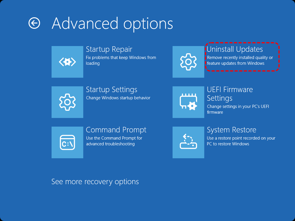 If your computer can’t boot properly after an update, you can try uninstall the latest update in WinRE. This way can often resolve boot errors caused by problematic system updates.