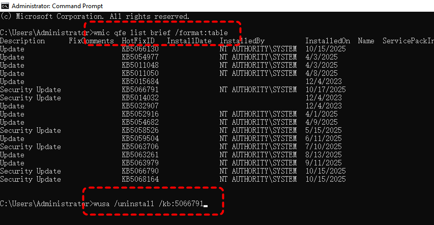 wusa /uninstall /kb:5066791: to remove the update (replace the number "5066791" with the actual update number).