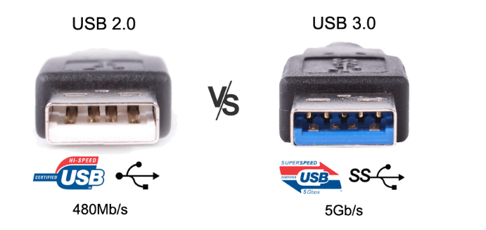 - Look at the port: USB 3.0 is often blue or marked with SS (SuperSpeed); USB 2.0 is usually black or white