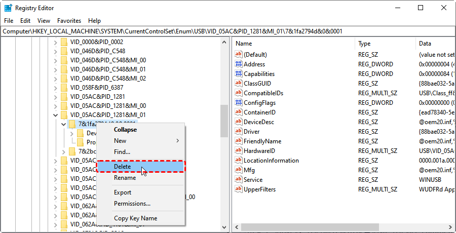 Step 4. Right-click the specific device entry → Delete.(Do not delete the entire USB key, only entries for the device causing issues.)