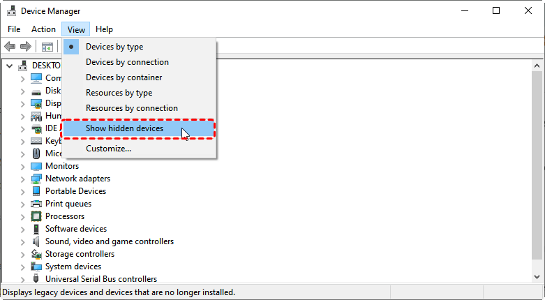 Step 1. Open Device Manager,click "View"→ "Show hidden devices".