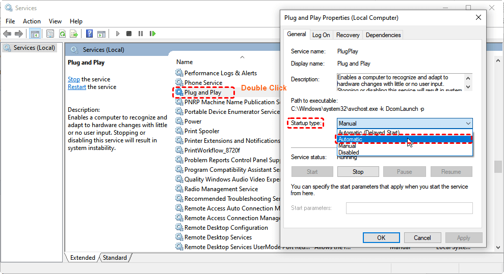 Locate Plug and Play, double-click it. Set Startup type to Automatic and make sure the service is Running. Click "Apply → OK".