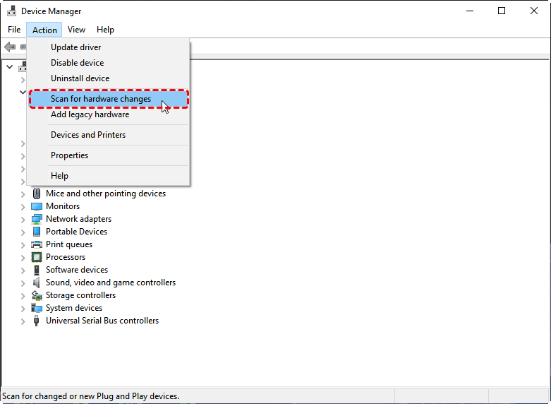 Step 3. From the Device Manager menu, choose "Action"→ "Scan for hardware changes".
