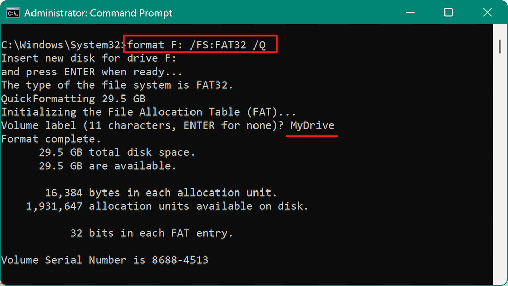 If, after successful data recovery with MyRecover, you wish to attempt repairing the USB drive itself for future use, you can return to the Command Prompt and then format it now.