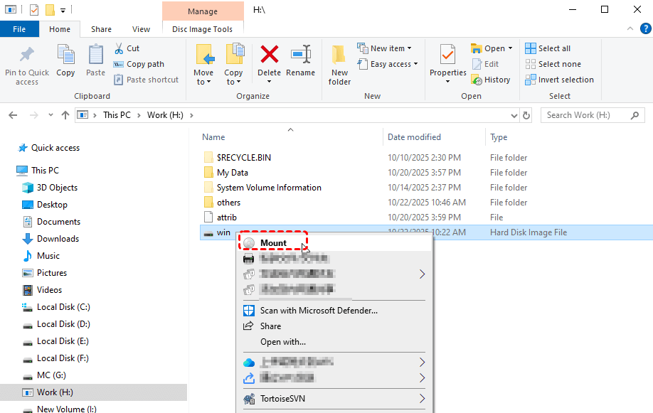 Step 1: Mount your VHDX file in Windows. Right-click the file and select "Mount." The virtual hard drive will appear as a new drive under "This PC."