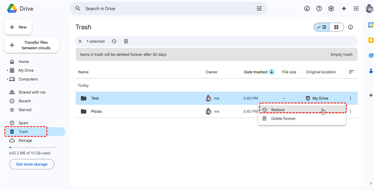 3. Select deleted file → Restore.