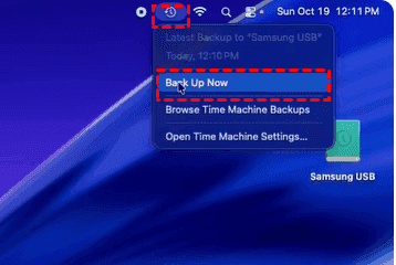 To run a manual backup at any time, click the Time Machine icon in the menu bar and select Back Up Now. If you don't see the icon, go back to Time Machine settings and enable Show Time Machine in the menu bar.