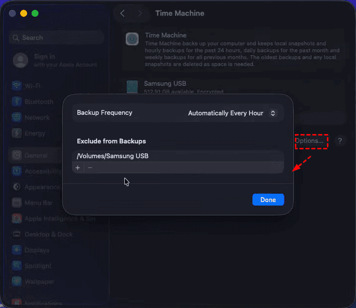 - Click "Options" to add folders you want Time Machine to ignore.