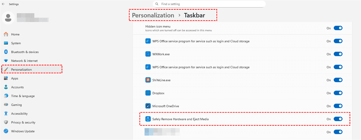 Now your hard drive is safely removed. However, the icon might sometimes be hidden. You can manage this in Windows 11 settings by going to Start > Settings > Personalization > Taskbar > Other system tray icons, finding the Safely Remove Hardware and Eject Media option, and then turning it on.